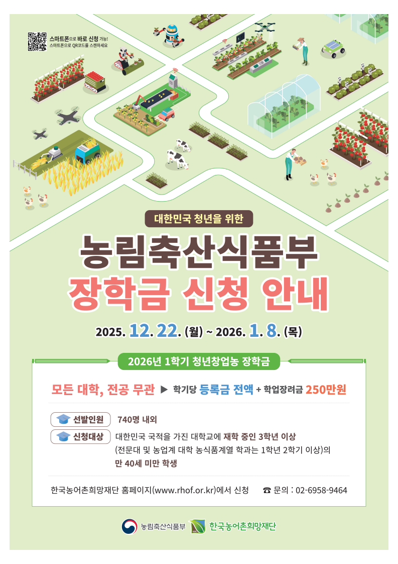 주요 내용 요약 신청기간: 2025. 12. 22.(월) 10:00 ~ 2026. 1. 8.(목) 17:00 신청자격: · 일반대학 3학년 이상 · 전문대학 1학년 2학기 이상 · 농업계대학 농식품계열학과 1학년 2학기 이상 · 성적 70점 이상, 12학점 이상 이수, 만 40세 미만 지원내역: 등록금 전액 + 학업장려금 250만 원 접수방법: 재단 홈페이지(PC 및 모바일) 온라인 신청 결과발표: 2026. 2. 23.(월) 예정