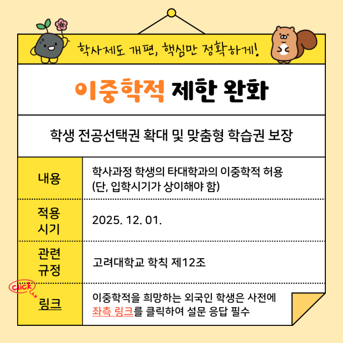 링크 | 이중학적을 희망하는 외국인 학생은 사전에 링크를 클릭하여 설문 응답 필수 |