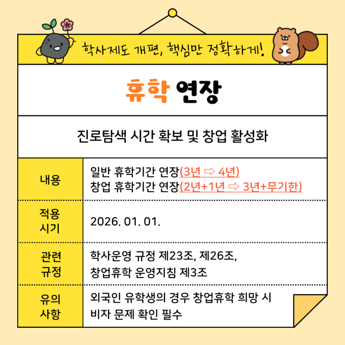 내용 | 일반 휴학기간 연장(3년 → 4년) 창업 휴학기간 연장(2년+1년 → 3년+무기한) |